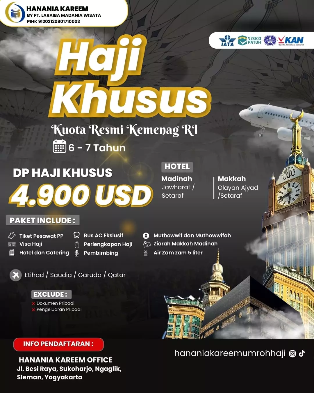 Paket haji khusus resmi Kemenag RI dengan bimbingan lengkap dan kuota terbatas.